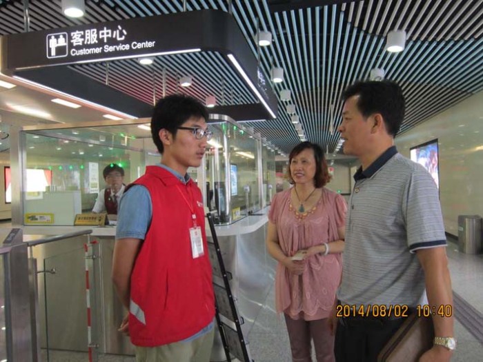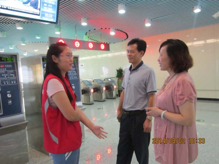 在一号线长广溪、江南大学两站站台上,耿校长一一询问志愿者们的工作情况,称赞同学们冒着炎炎酷暑,任劳任怨,为民志愿服务的高尚行为,表达了学校对志愿者工作的关心与慰问。在长广溪车站,耿校长还特地向该站杨枫站长询问我校志愿者工作的情况。杨站长对该站8名志愿者的表现很满意,称赞志愿者都能严格遵守操作规程,积极主动工作。最后同学们纷纷表示:我们将会用真诚的微笑和热情的服务帮助乘客购票、给乘客指引正确的进站和出站方向、主动帮助老年人和小孩、有秩序的组织乘客排队候车、照看好每一道安全门,让志愿者成为无锡绿色文明交通的倡导者,并人人努力争做优秀志愿者、共同争创优秀志愿者团队。